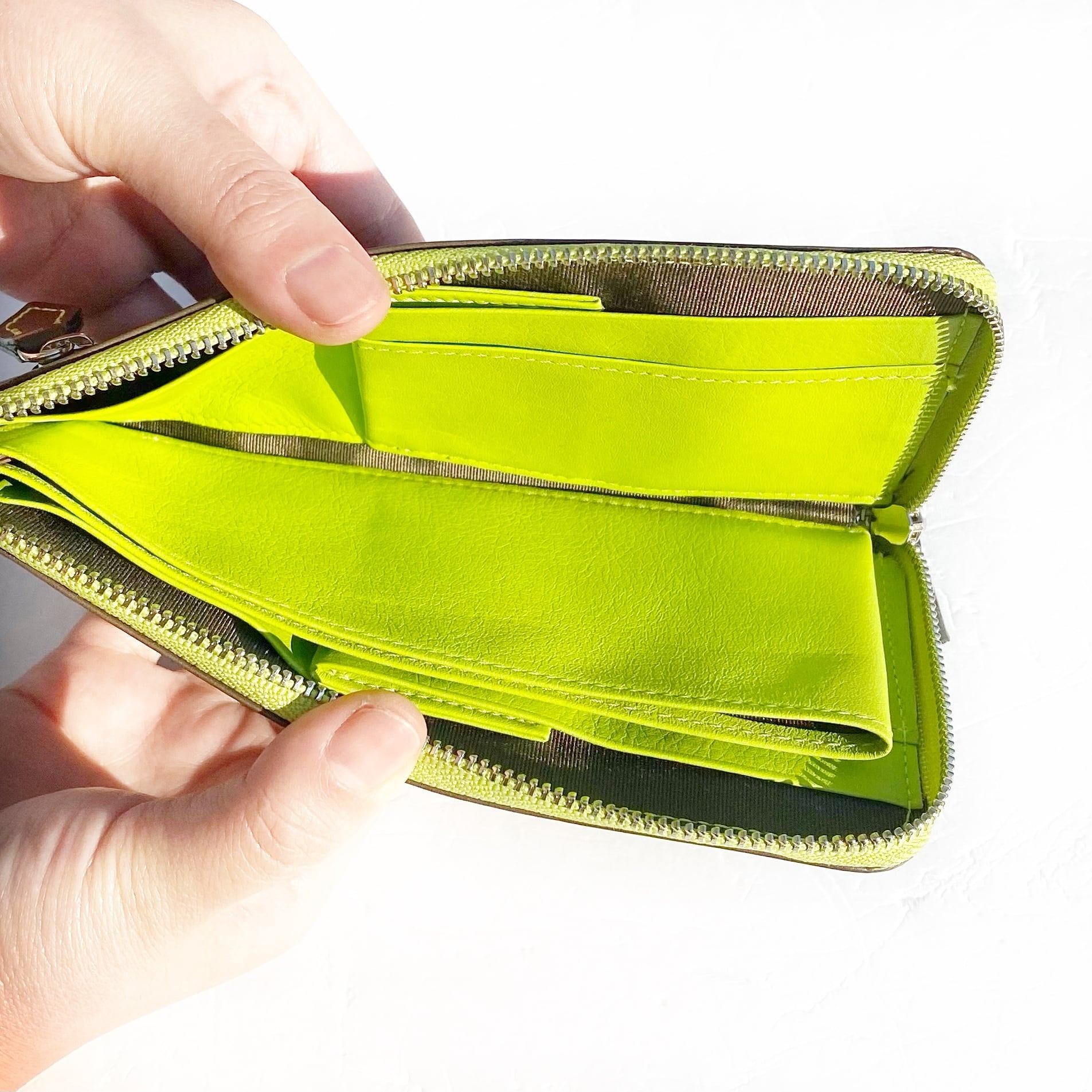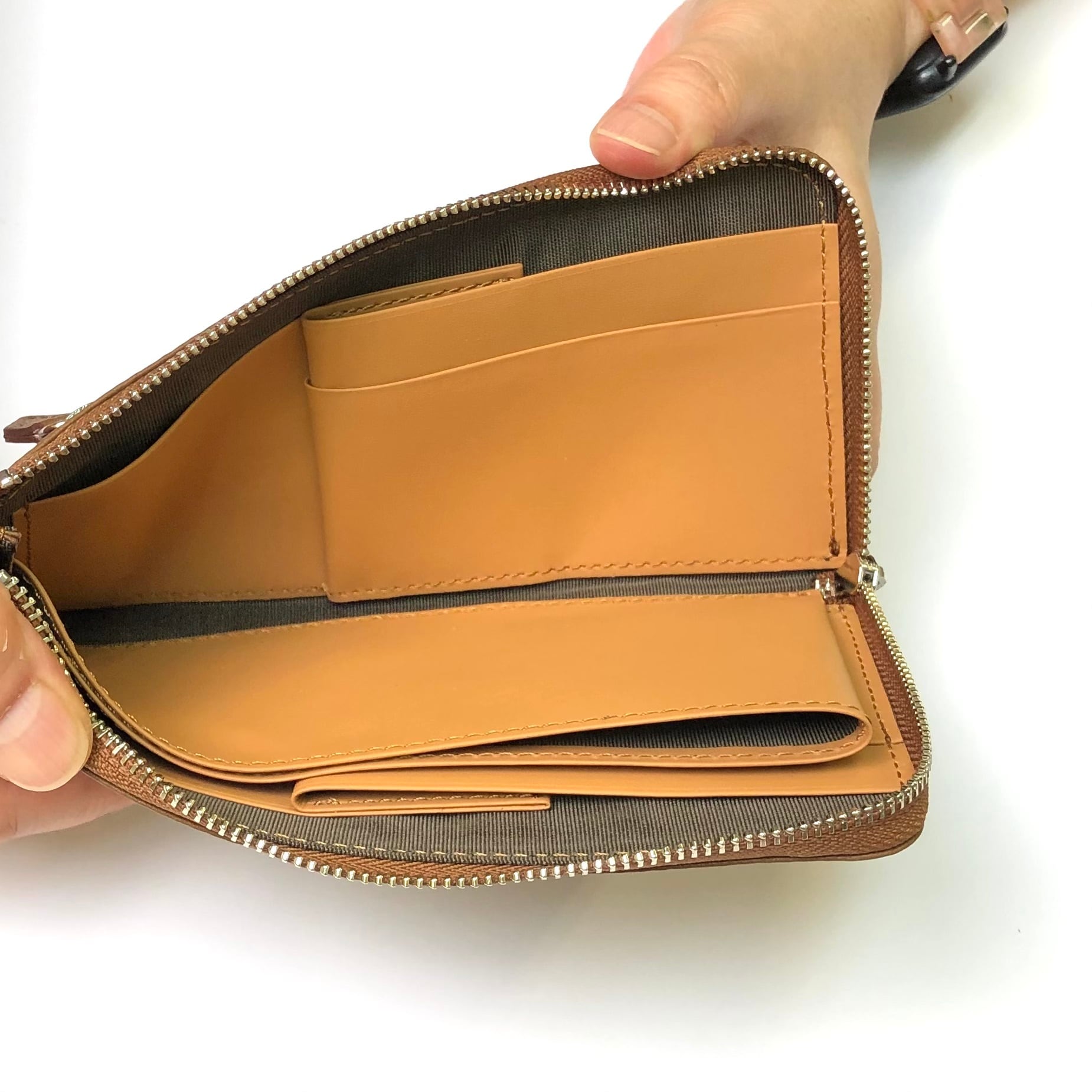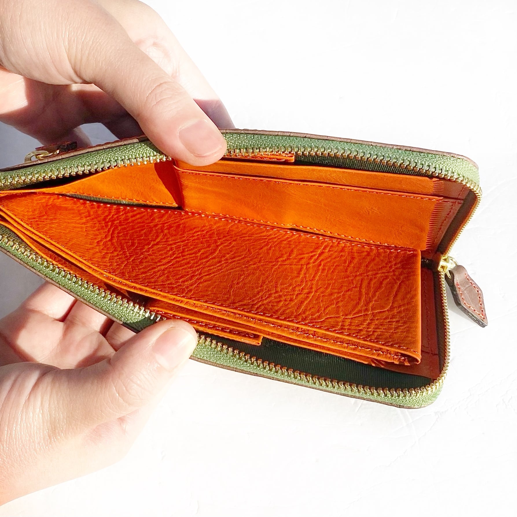 1万円札が折らずに入る最少サイズの長財布です。