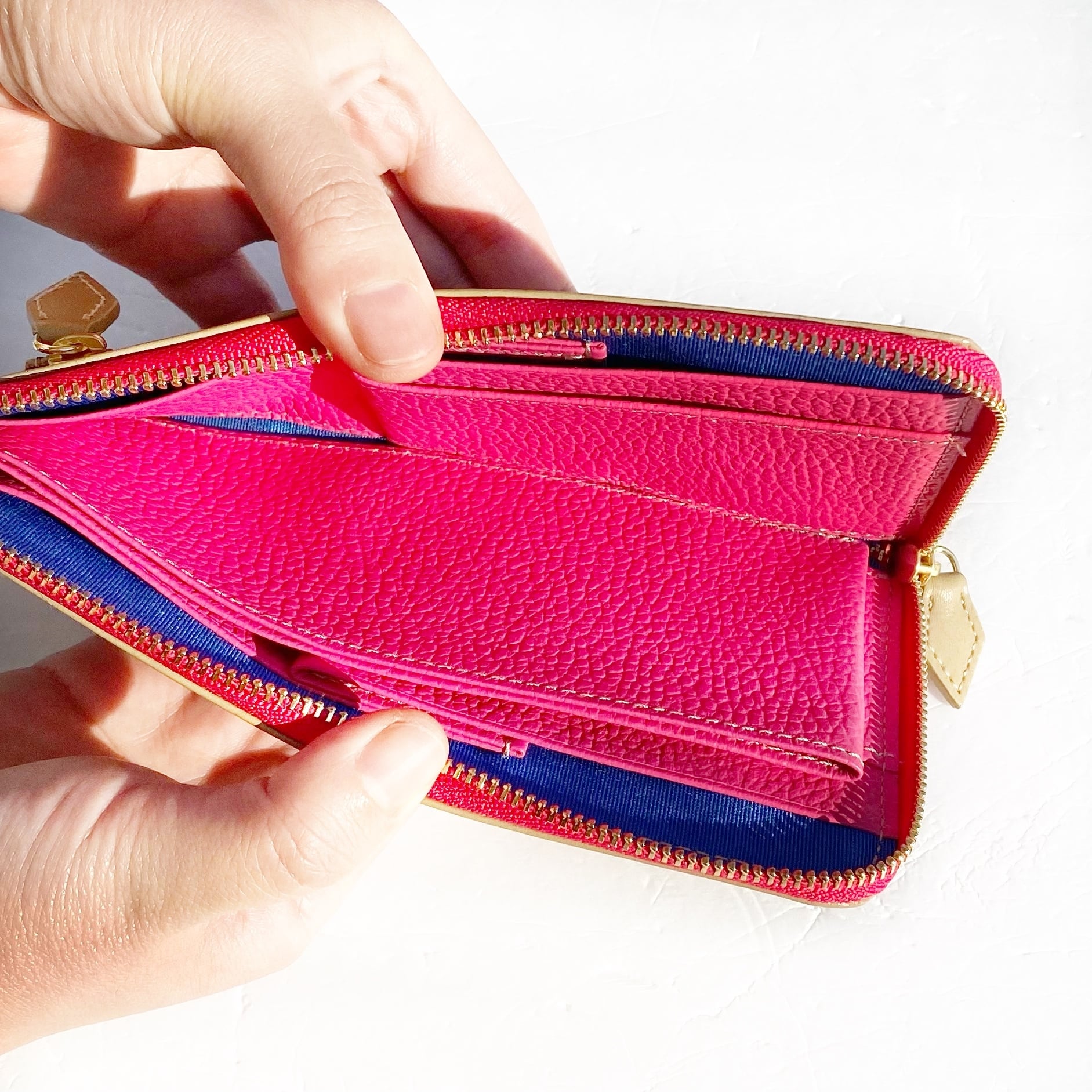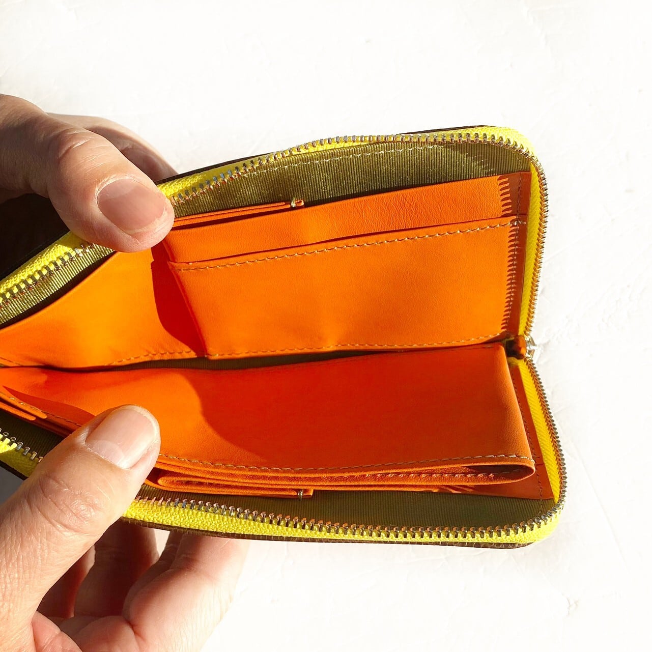 内装やファスナーを配色にしたり、表情のおもしろい革を選んでデザインしました。